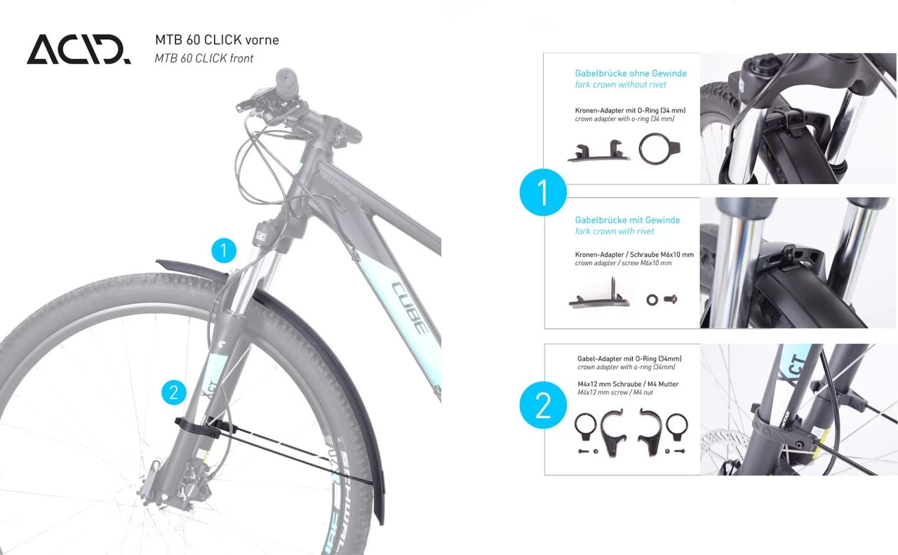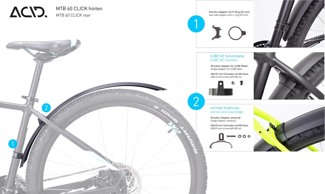 Click and go! Mudguard mounting has never been so practical! The ACID Mudguard Set MTB 60 Click is compatible with most 27,5″-29″ mountain bikes and a maximum tyre width of 2,25ââ. Thanks to the special adapter solution for CUBE mountain bikes from model year 2019, mounting is super fast. The torsion-resistant profile design makes the mudguards resistant and durable.