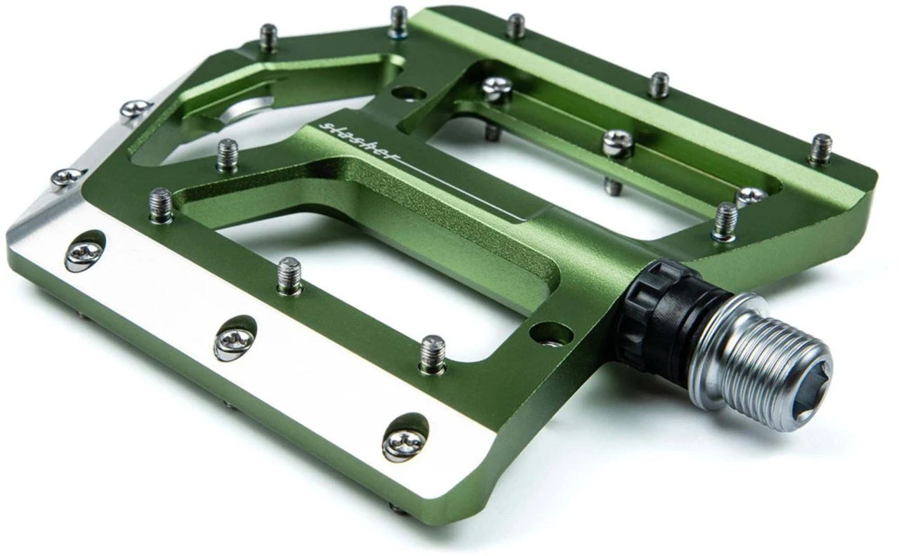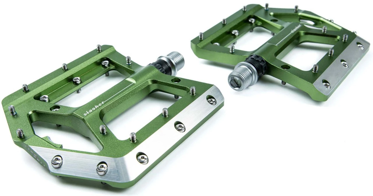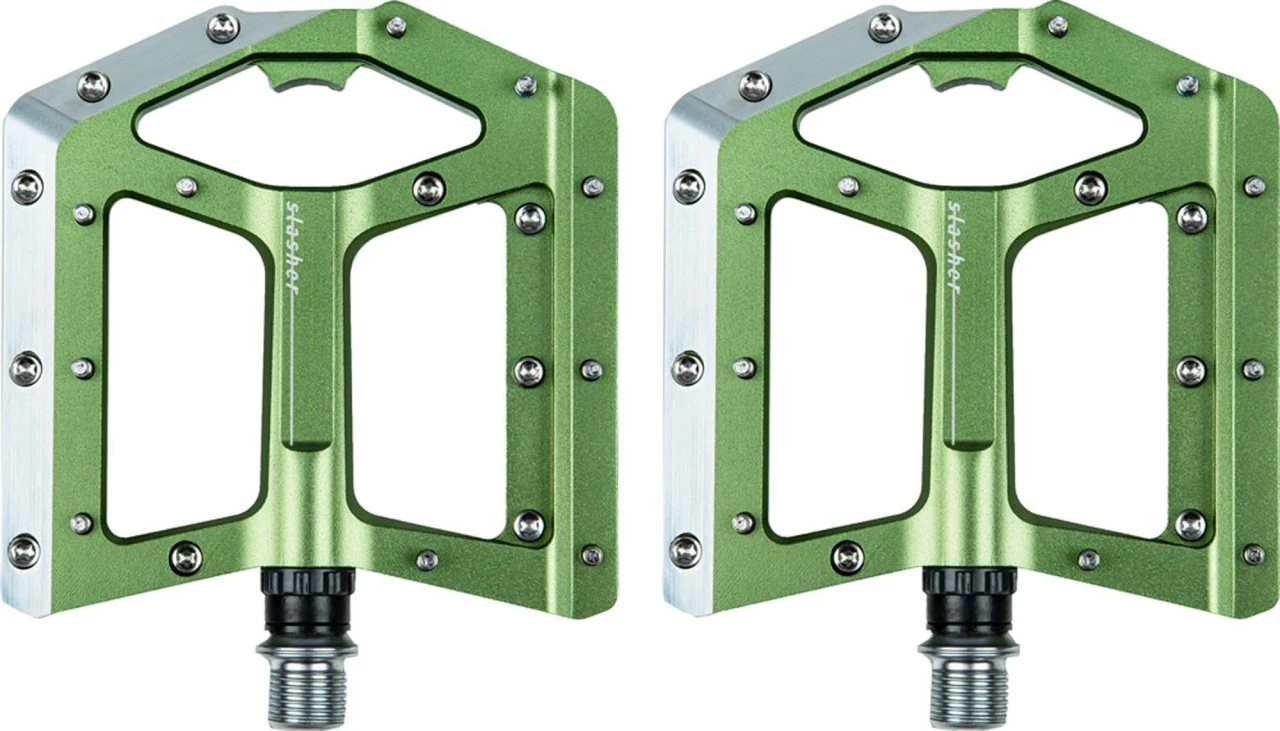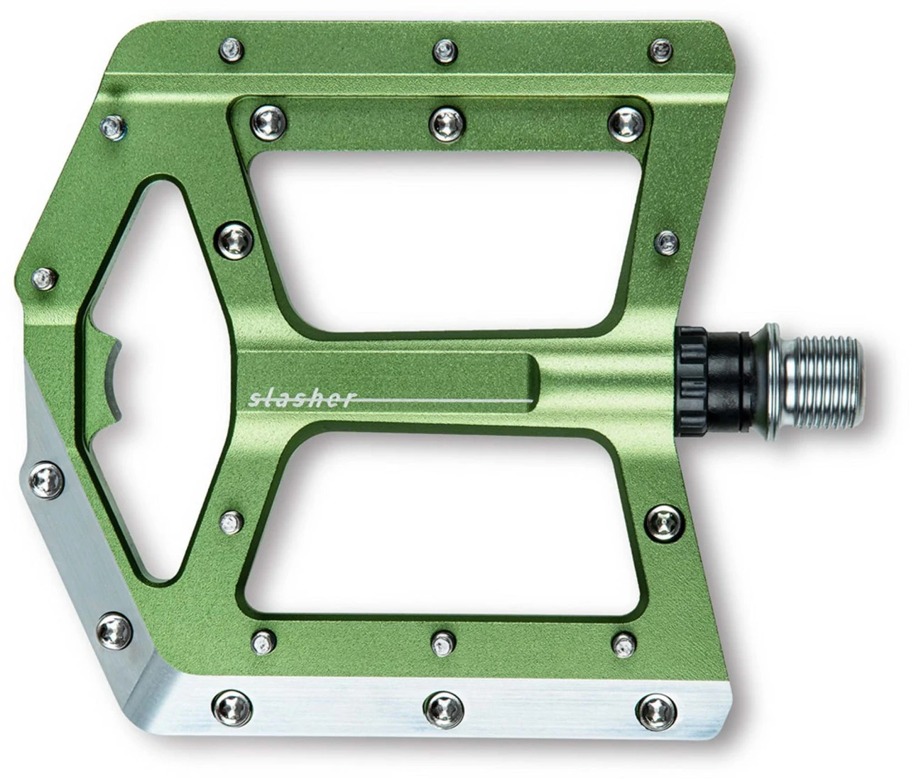 Slasher pedals from CUBE – The eye-catcher on every bike. With the integrated bottle opener, the newly designed and lightweight flat pedal is unquestionably the highlight on and after every tour. But the Slasher has much more to offer. The ultra-flat profile ensures less weight and chamfered edges for more ground clearance in the corners. The triple-bearing aluminum body of the flat pedal uÌberzeugt with an elaborate two-tone CNC machining and 10 interchangeable pins per side.