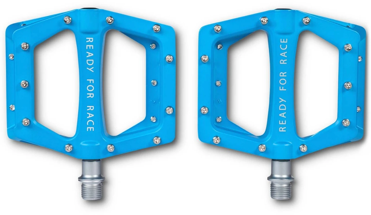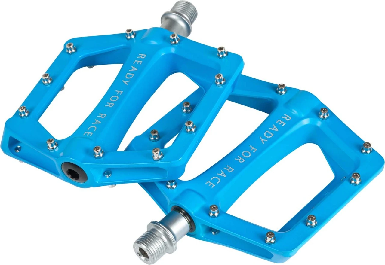 The lightweight flat pedals are made of aluminium and are installed with a Cr-Mo axle. The anti-slip pins are replaceable and offer best grip on the Fahrrad.